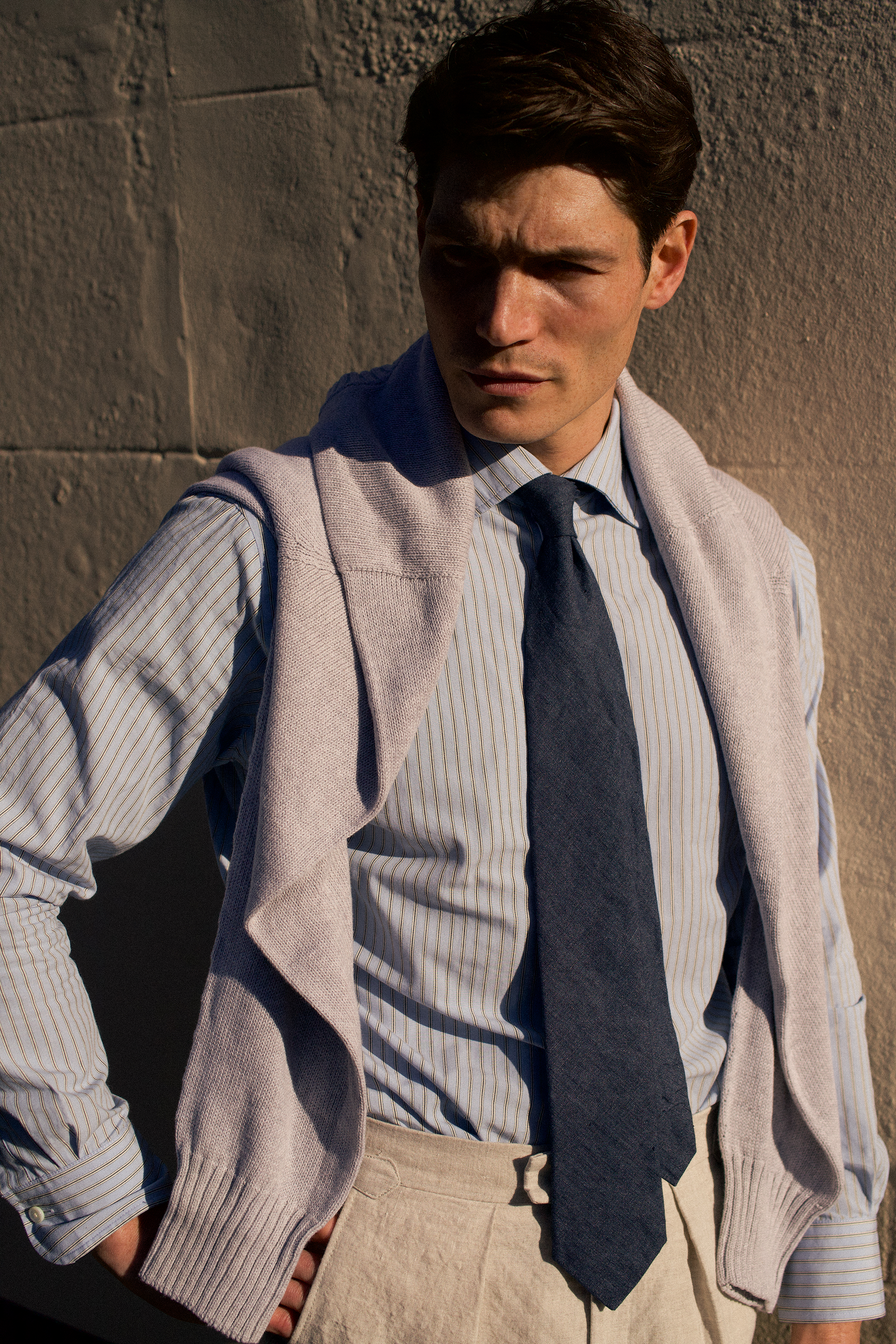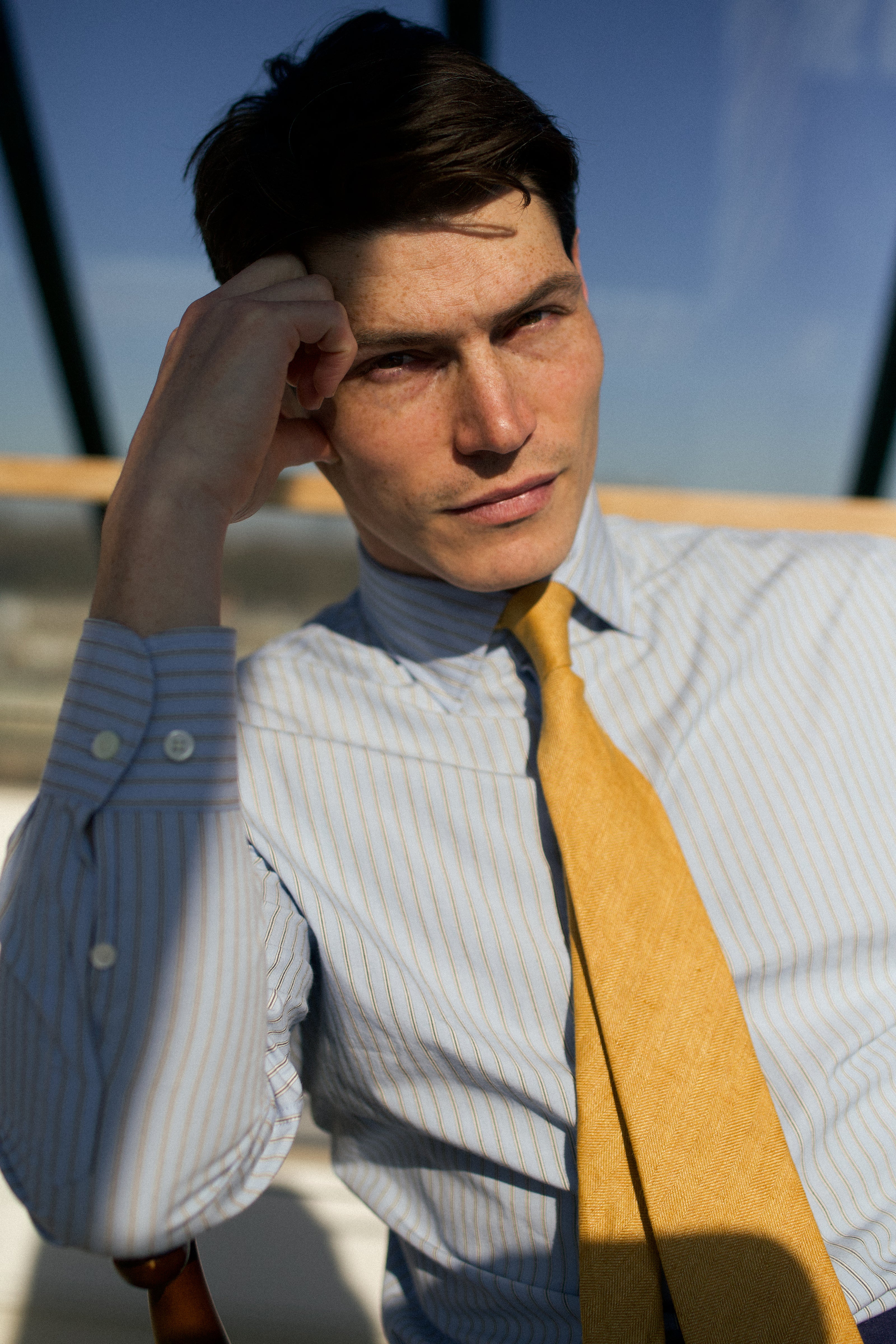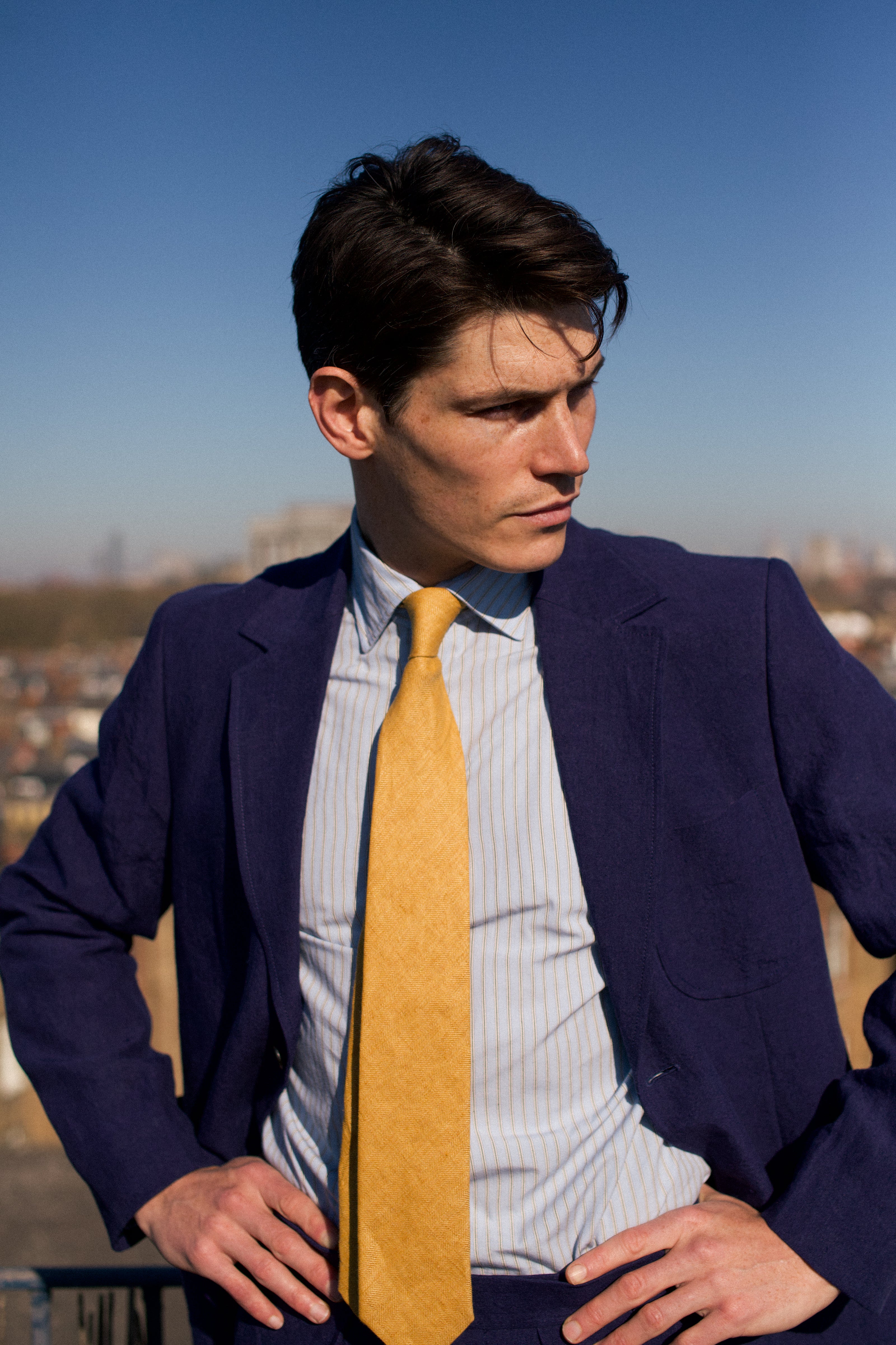 Sam wears the Laundered Linen Suit Navy Blue, an Organic Cotton Blue Bar Stripe Formal Shirt and a Ochre Linen Tie.