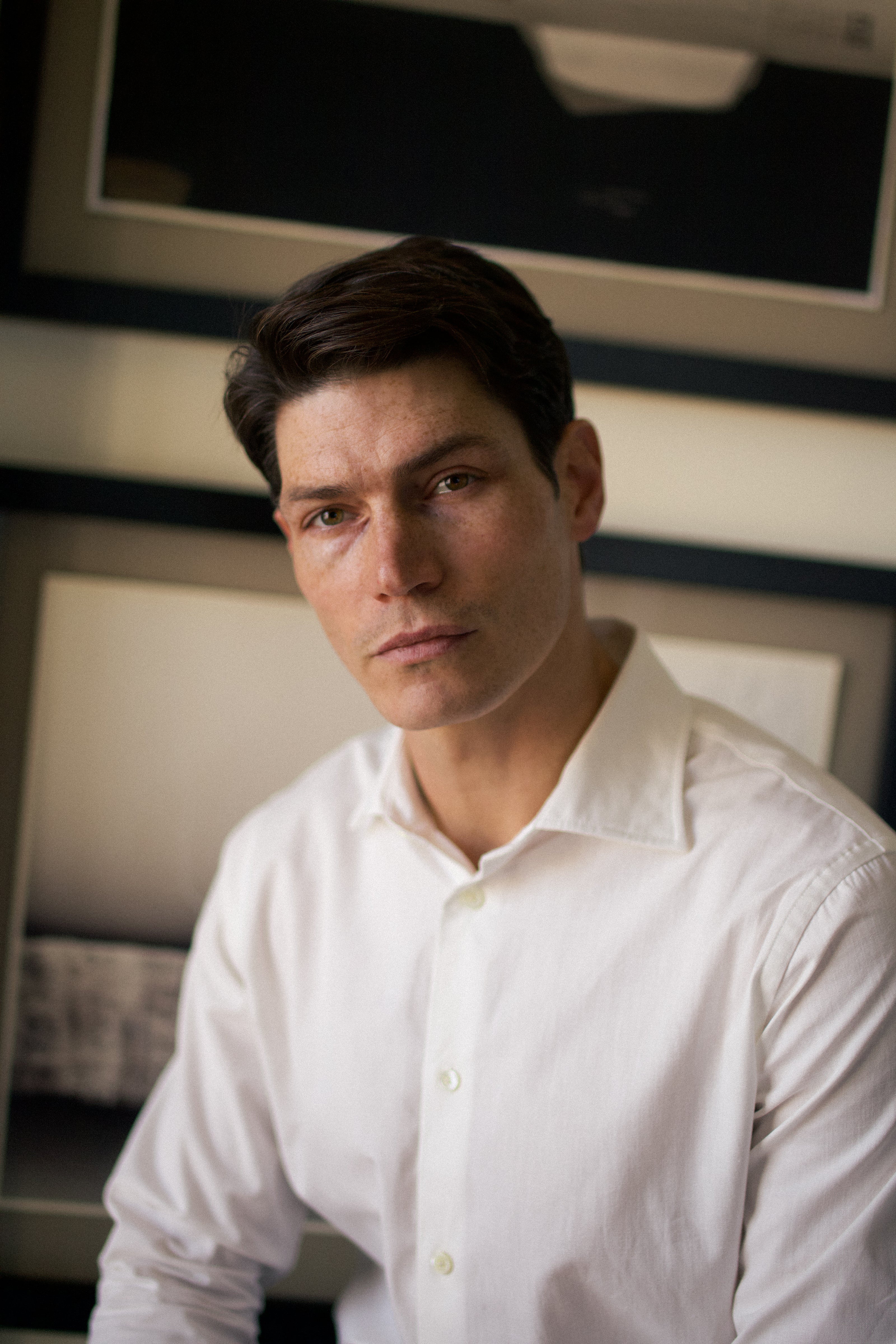 Sam wears a Pure White Linen / Cotton Formal Shirt.