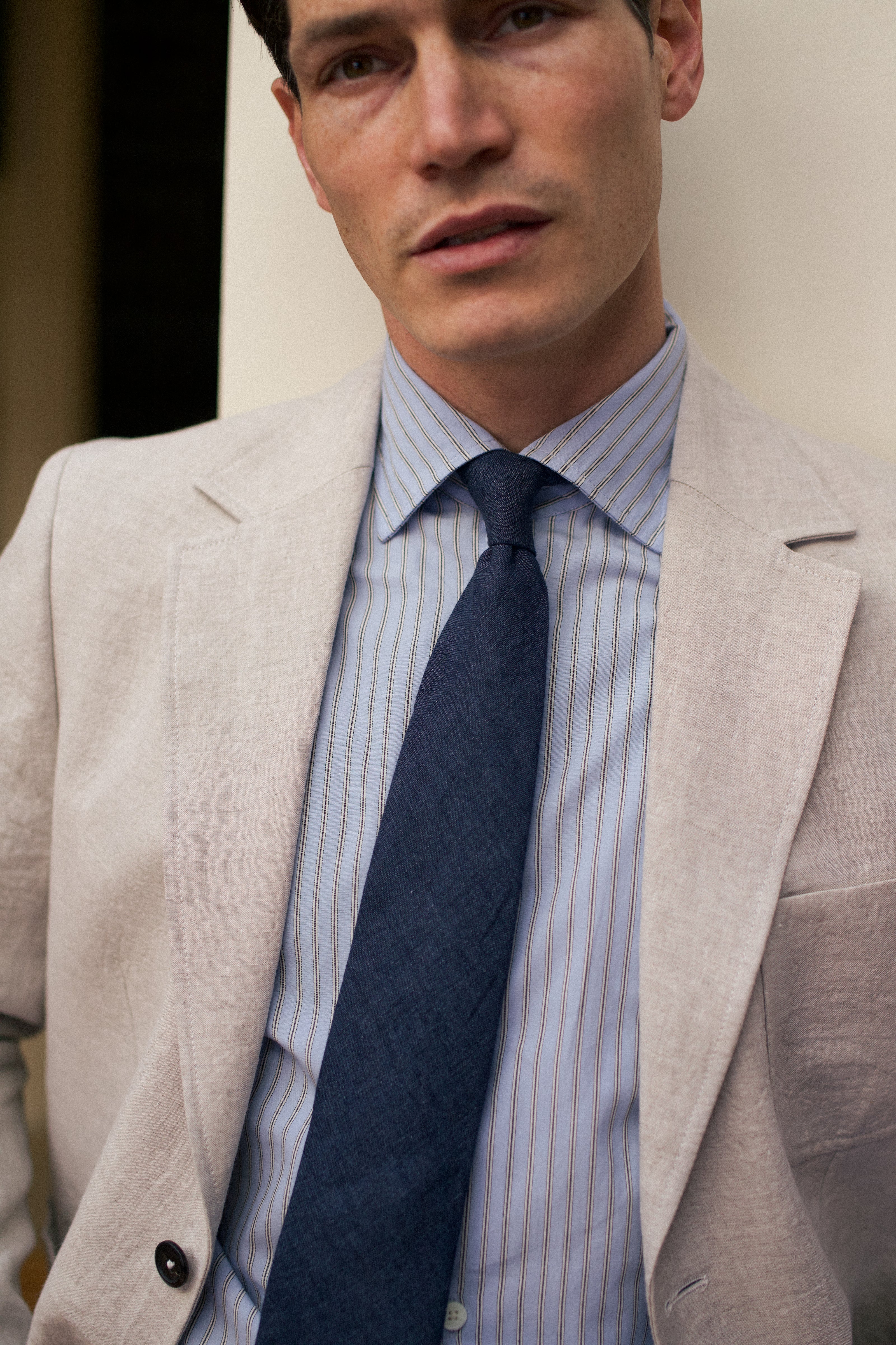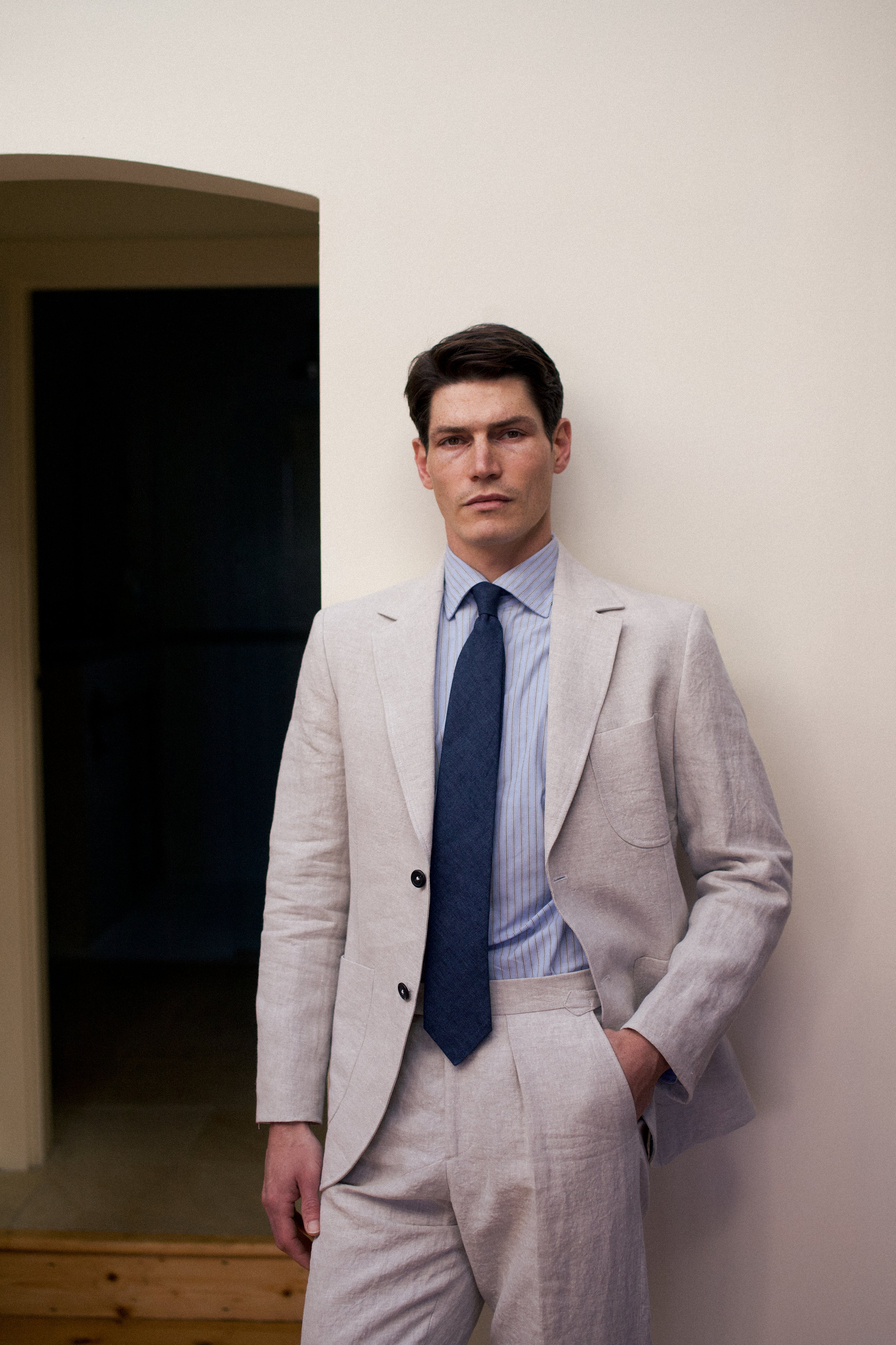 Sam wears the Laundered Linen Suit Oatmeal, an Organic Cotton Blue Bar Stripe Formal Shirt and a Denim Blue Linen Tie.