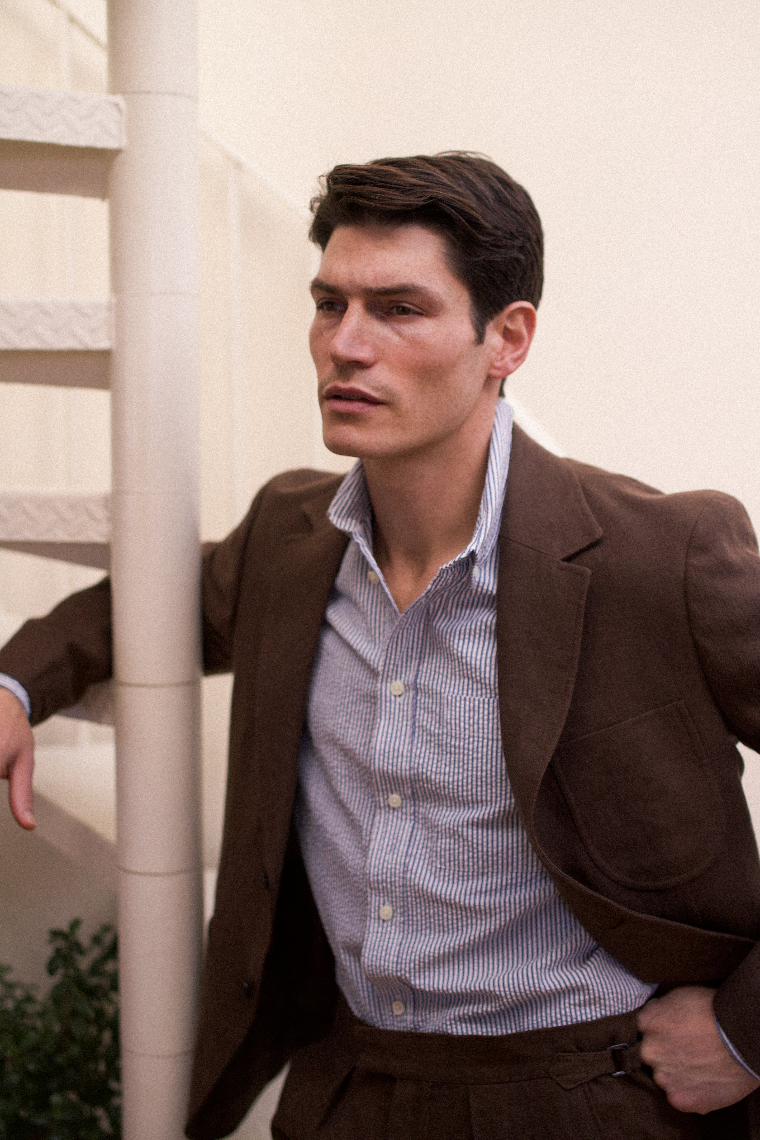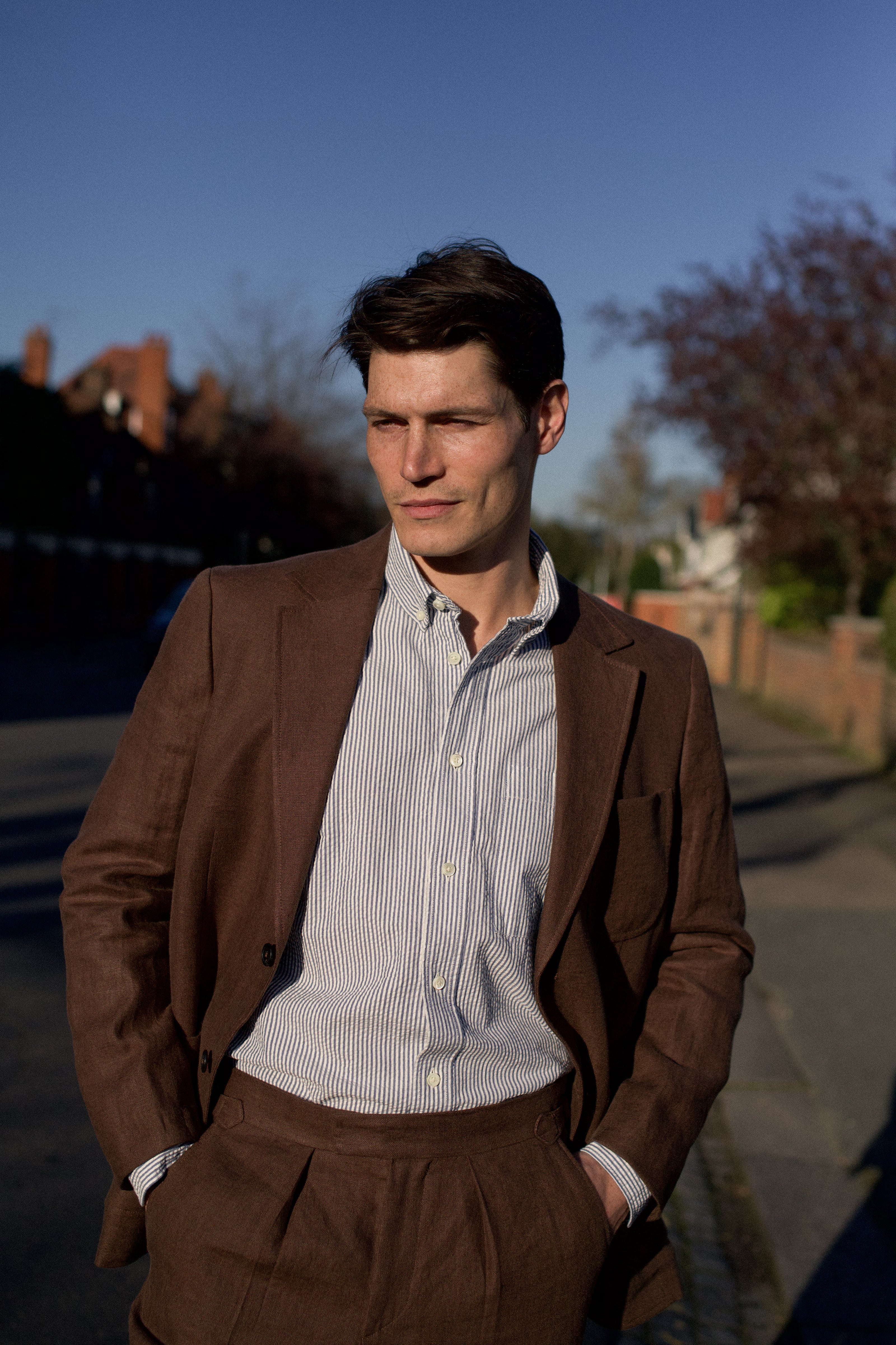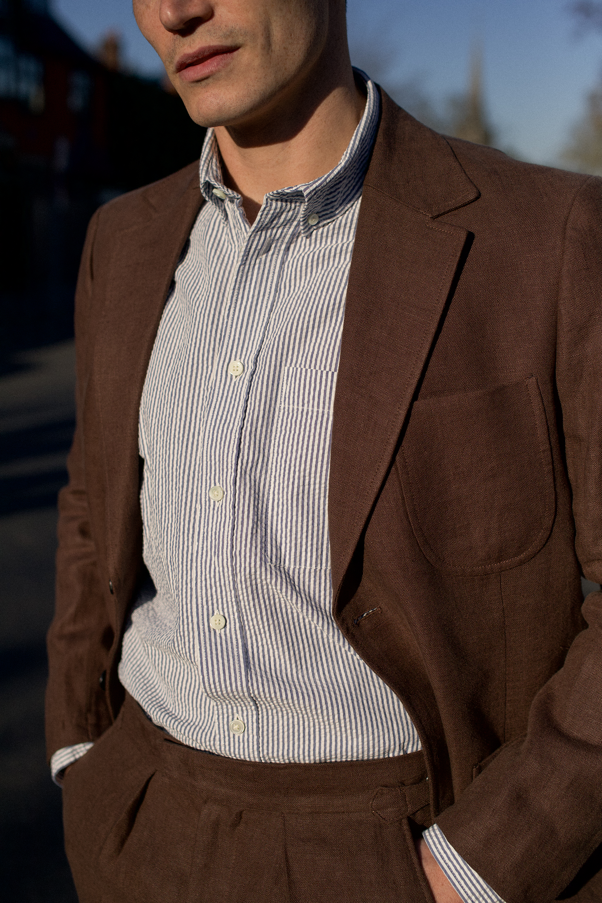 Sam wears the Laundered Linen Suit in Tobacco Brown with the Seersucker Organic Cotton Button Down.