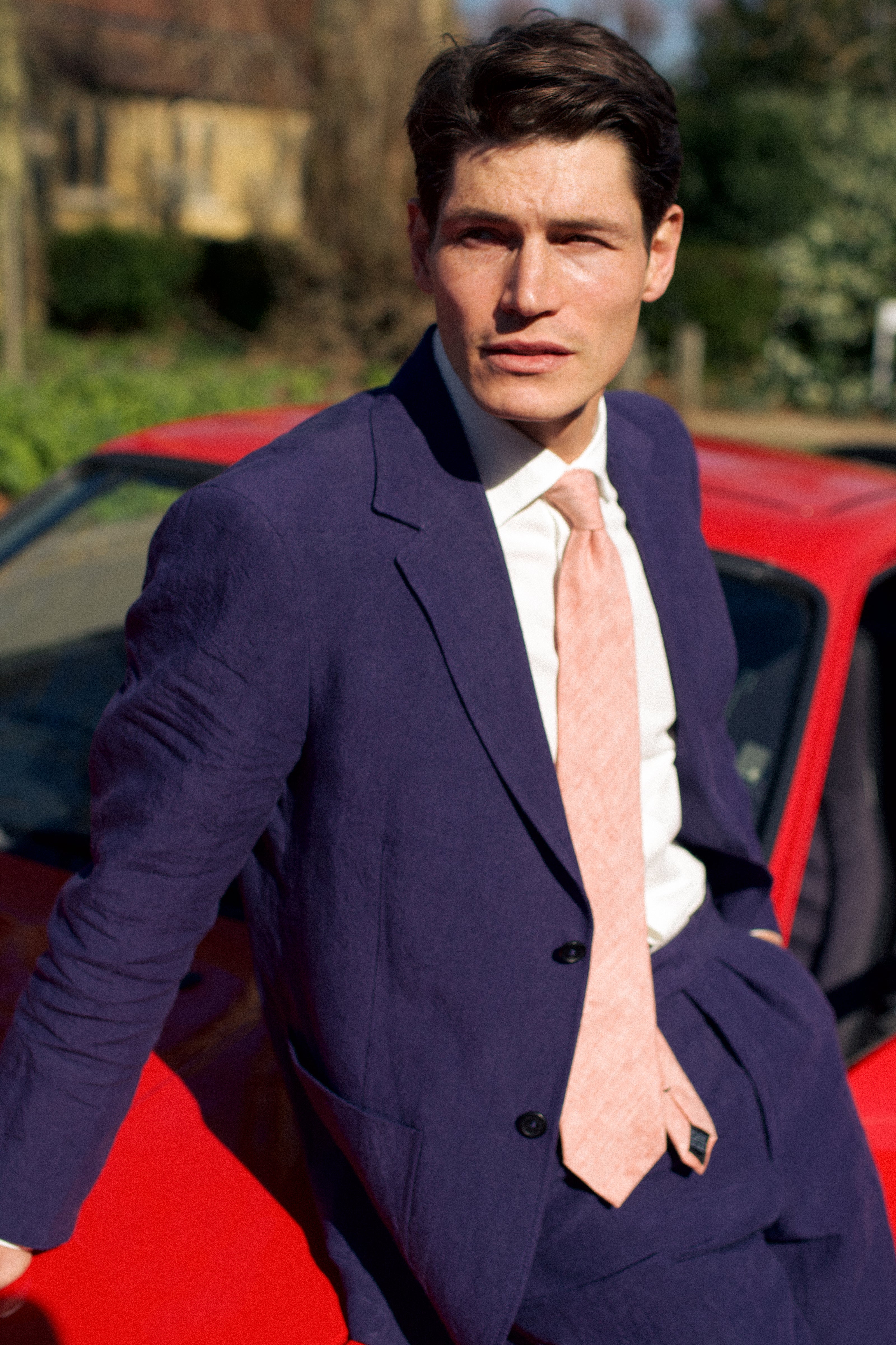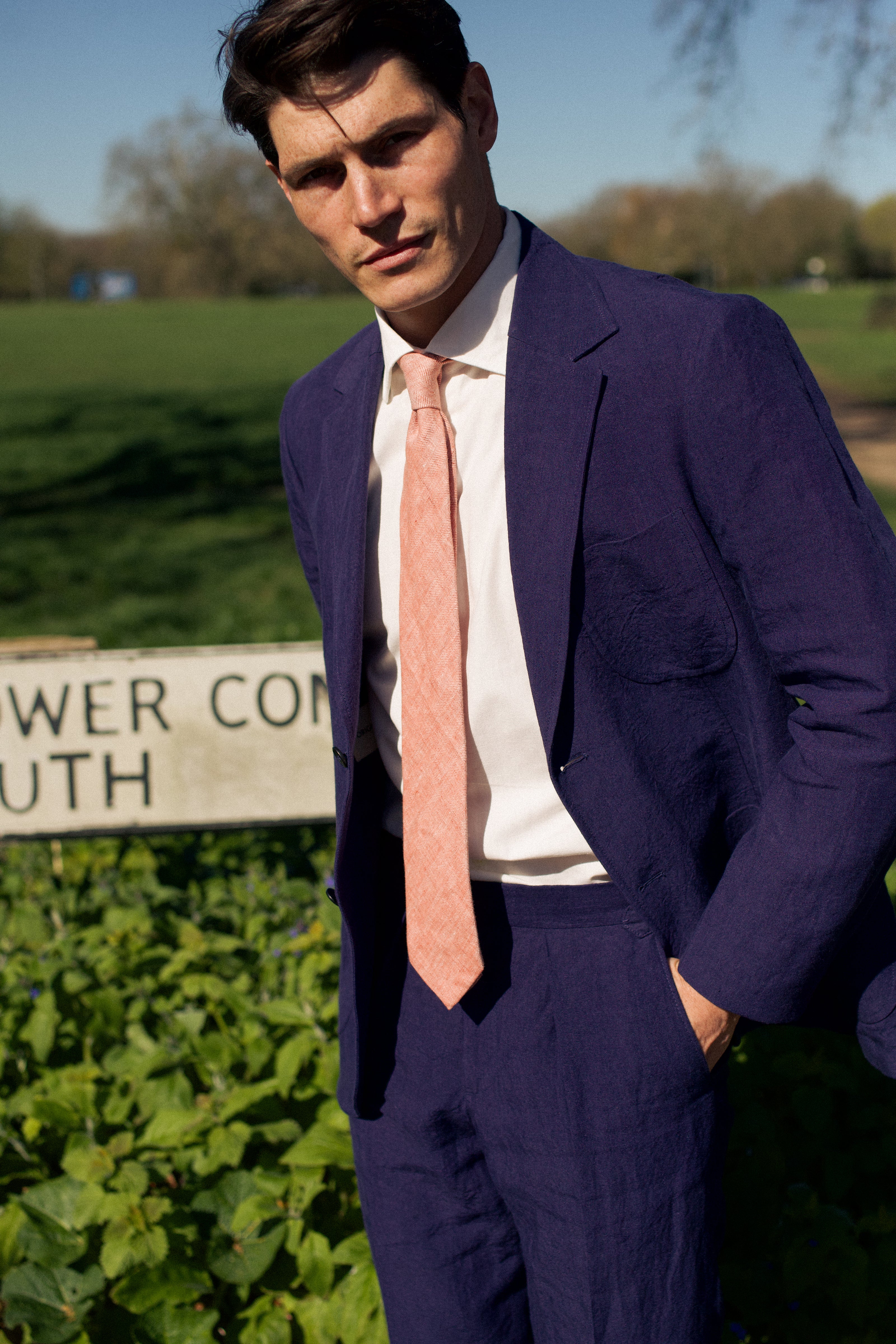 Sam wears the Laundered Linen Suit Navy Blue, a Pure White Cotton Linen Formal Shirt and a Rose Linen Tie.